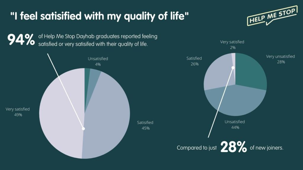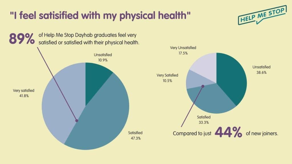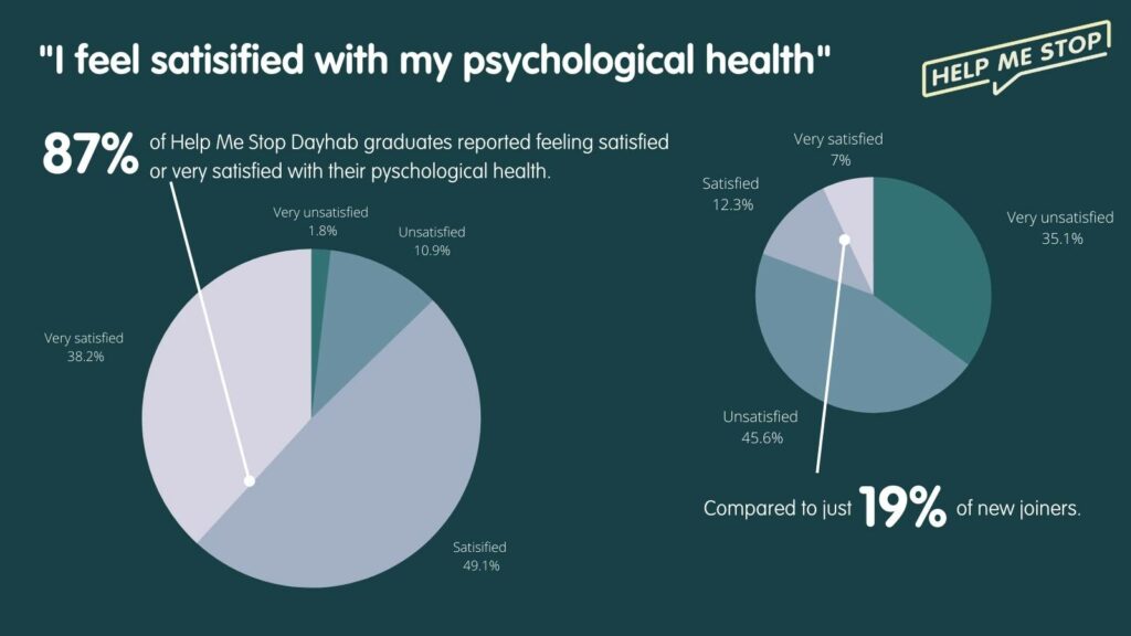 The biggest satisfaction gain is in psychological health. 87% of Help Me Stop Dayhab graduates feel satisfied or very satisfied, compared to just 19% of new starters.
