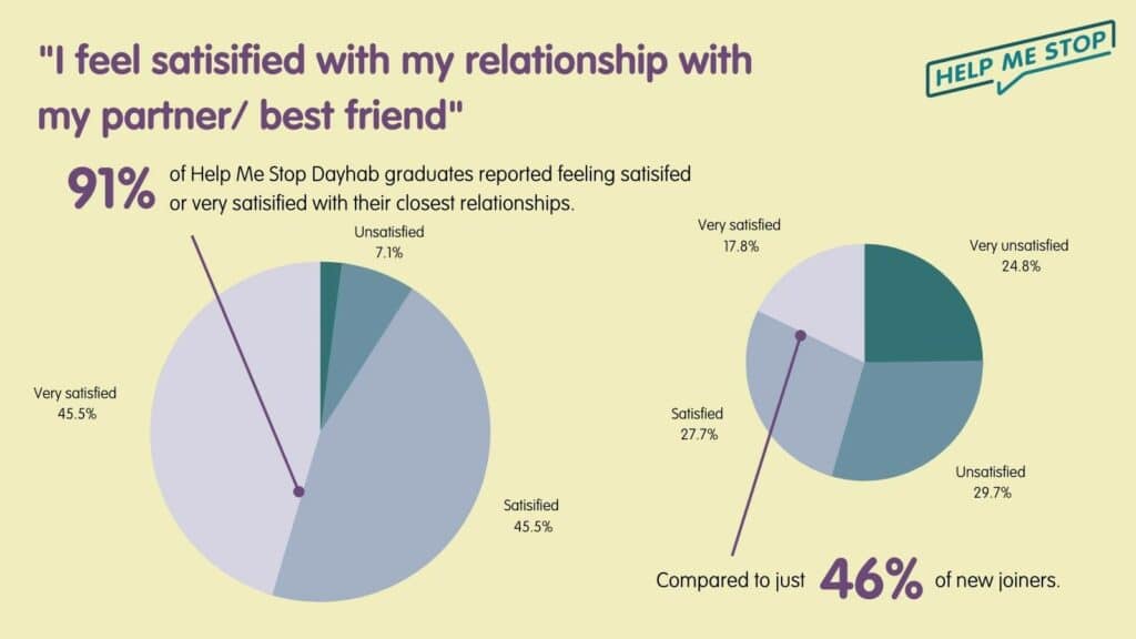 Following treatment for addiction with Help Me Stop, satisfaction with closest relationships doubles: 91% compared to 46% of new joiners.